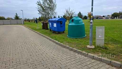 Kontajnery na triedený odpad pohodené na trávniku v centre obce